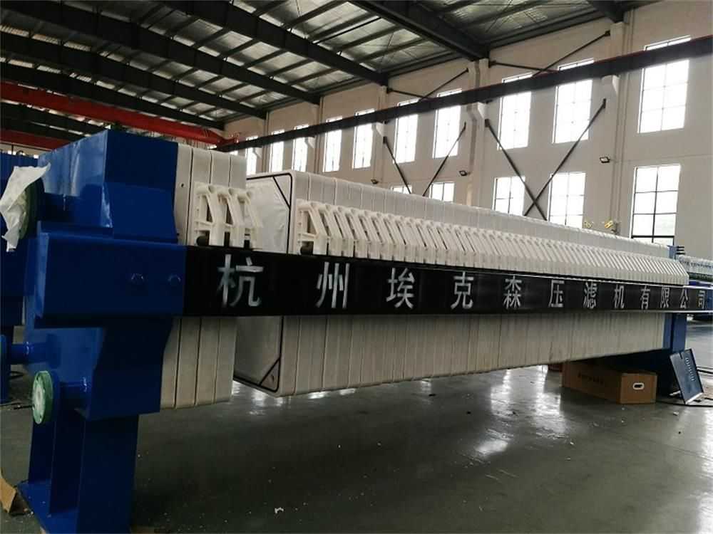 隔膜壓榨壓濾機是由隔膜板和廂式濾板排列組成濾室,在輸料泵的壓力作用下將料漿輸入濾室,通過過濾介質(濾布)將料漿中的固體和液體分離,當料漿中的固體形成餅后,再向隔膜通入空氣,對濾室內的固體充分壓榨。